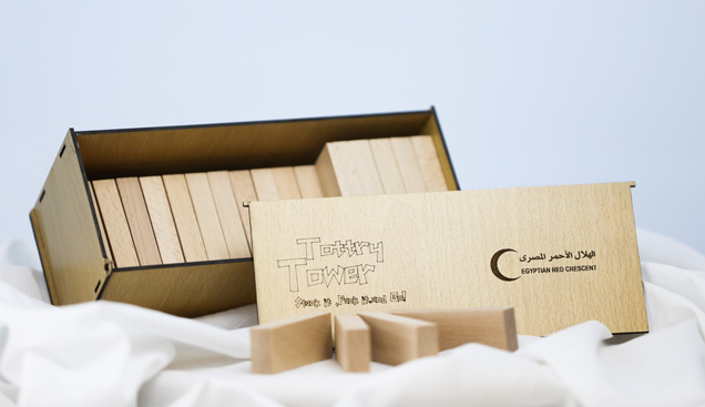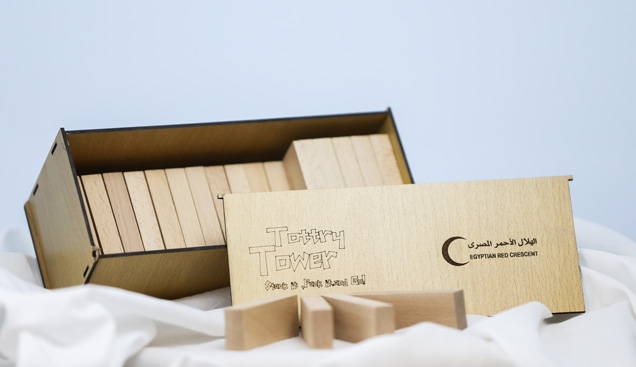 Jenga Tower game (48 pieces) with a wooden box bearing the Egyptian Red Crescent logo